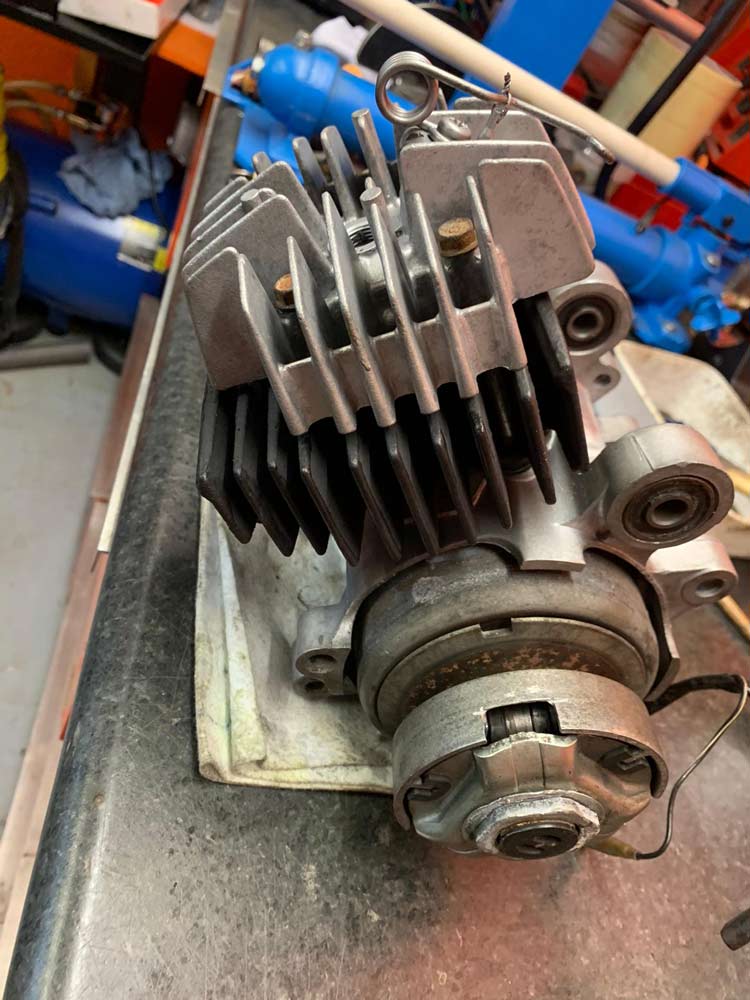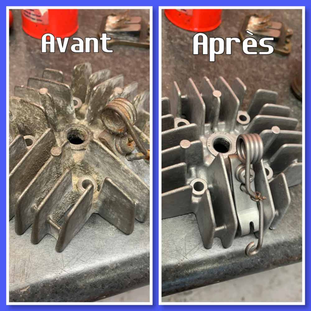 Puis on remonte le tout. Je m’occupe du réglage de l’allumage, j’ouvre le carburateur et m’occupe du nettoyage du carburateur par microbillage pour les pièces compatibles et ensuite par ultrasons. Remontage et suspens… l’ancêtre tourne à nouveau! Et la magie a opéré… avec mon coup de main.