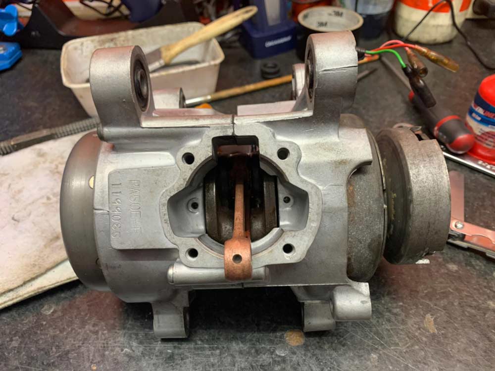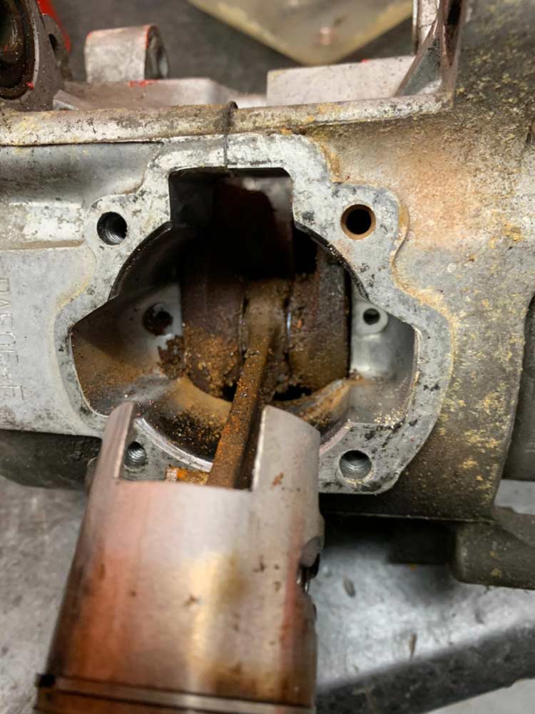 Je démonte et j’analyse le problème… le moteur est bloqué par la rouille! Que faire? J’en parle au client et nous tombons d accord sur le fait qu’il faut essayer de la faire tourner, mais sans investir des sommes trop élevées. je démonte. On ouvre le moteur pour nettoyer et remplacer les roulements de vilebrequin et les bourrages.